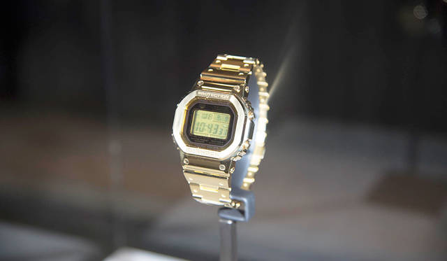 NYでお披露目された世界で1本しかないDW-5600ゴールド仕様。ベルト部分ももちろんゴールド