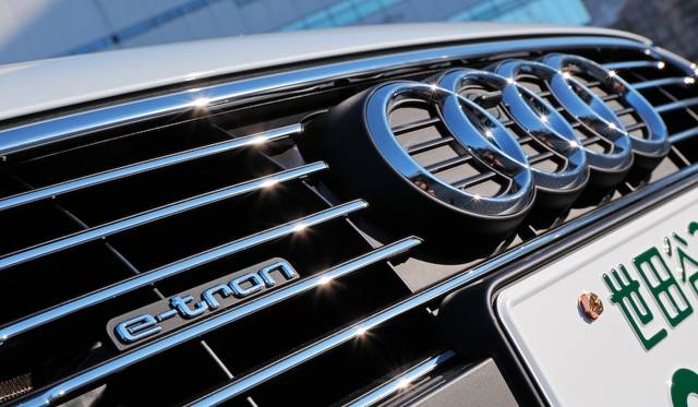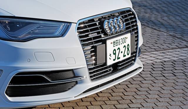充電口は、フロントのアウディマークをスライドさせるとあらわれる。ソケットは日本仕様なので、既存充電設備の多くで利用が可能だという