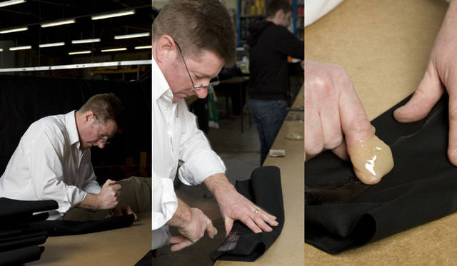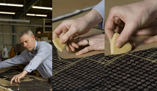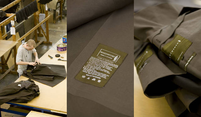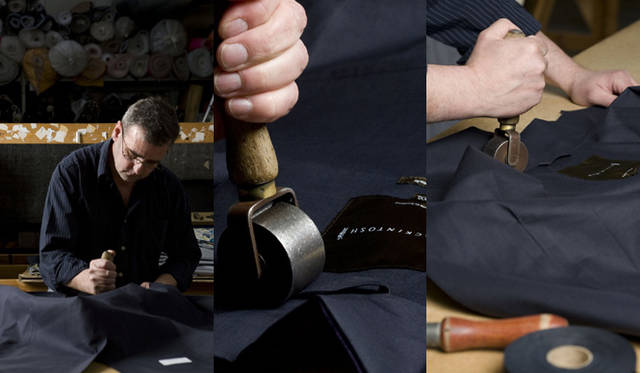 ロンドン・サヴィルロウの仕立て職人の技術と勝るとも劣らない力量のほどを見せるマッキントッシュの職人たち。自信に満ちたその表情は、ジョンブル魂そのものだ。使い込まれた道具とともに男たちの手は、日々あたらしいマッキントッシュを生み出している