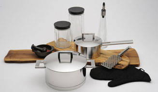 <strong>LIVING MOTIF|リビング・モティーフ</strong><br />ジョン・ポーソンによる機能美を極めたデメイエレのステンレス鍋。必要な機能をすべてもちながら完璧なまでにシンプルなフォルムを実現。「John Pawson for demeyere」 鍋3万2400円~、カッティングボード8640円~、ジャー・オイル差し3024円~、スパイスミル6696円