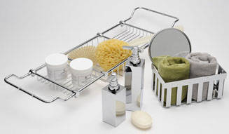 <strong>LIVING MOTIF|リビング・モティーフ</strong><br />パウダールームの雰囲気をグレードアップしてくれる、デコワルターのバスアイテム。クロームシリーズのほか、さまざまなテイストから選ぶことができる。「DECOR WALTHER」バスシンクラック3万4560円、ソープディスペンサー2万5920円~、マルチボックス7992円