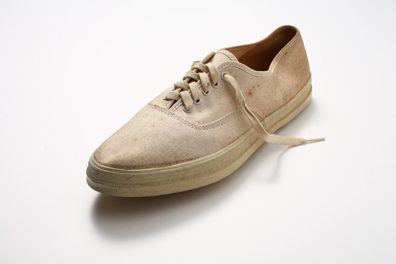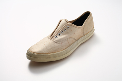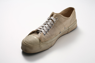 このBF GOODRICH社の「ジャックパーセル」は80年代始めにロスでヴィンテージで買ったものです。ロスにマニアックな60年代愛好家たちが立ち寄る“カウボーイ&プードル”というヴィンテージ屋があったんですね。70年代にジョン・レノンが白のスーツのバギーパンツに運動靴を合わせていて、そういう影響も受けて履いていました。