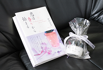 新間さんが書かれた 『恋は香りから始まる』 と、おみやげにいただいた、新間さん調香の <さくら> の香りのハンドクリーム