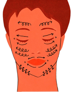 口もとやフェイスラインは、しゃべったり食べたりすることで口筋がつねに動いているので、どういうふうに押しても問題ありません。くちびる上下とも、くちびるのラインに沿って中央から外にむかって指を流し、最後に口角にあるツボを軽く押します。フェイスラインは、顎を両手で少しづつ上につまんでいく程度でしょうか。表情癖によるシワや、加齢による法令線を避ける必要はありません。“気持ちいい”マッサージなら、その線を太くすることは絶対にない。そんなに皮膚は弱くありませんから。むしろ、マッサージすることでその進行を遅らせることができます。