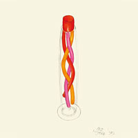 1997年にエットーレ・ソットサスが描いたデザイン画原本は、透明で、ほっそりとした卵形の、先端がやや絞られたフォルムのボトル。ボトル内には、鮮やかなレッド、オレンジ、ピンクの蛍光色のモールが絡み合い、ガラスの透明性を照らし出し、輝かせる。