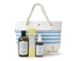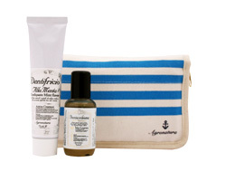「アグロナチュラ トラベルボディケアセット」は、旅の必需品もオーガニックコスメで揃えたいというひとにお薦めのセット。マリンテイストのポーチも、バカンスを楽しく演出してくれる。
