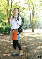 コーディネート|機能性シャツ、スカート「Lowe Alpine」、タイツ「CW-X」、シューズ「caravan」、バックパック「MILLET」