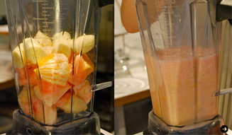 ミキサーに、カットした桃、バナナ、オレンジをいれて撹拌(かくはん)します。