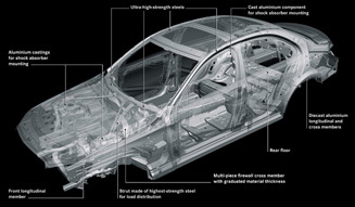 次に、軽量化だ。ボディ構造のうち、アルミニウム素材の占める割合を実に48パーセントまで飛躍的に高めた。結果、従来型に比べてボディサイズがアップし、さまざまな機能装備が増えているにも関わらず、実に100キロ前後のダイエットに成功している。パワートレインの進化とともに、いっそうの効率化に向けて大きな貢献を果たしているといえそうだ。