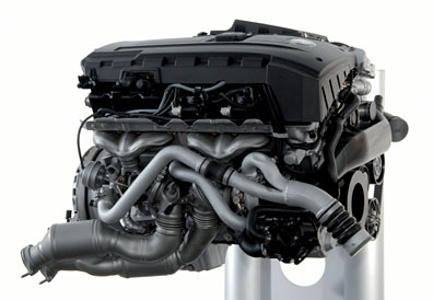 335iクーペの心臓、306馬力を発生する直噴3リッター直6ツインターボ。写真下側、波打つエグゾーストパイプに埋もれるかたちで小型ターボ・チャージャーが備わる。大型1基ではなく、小さなターボを2基とすることで、レスポンスのよさを追求した。