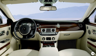 先進のテクノロジーと伝統的なデザイン要素が組み合わされているのも、ゴーストの魅力にあげられる。内装は高品質の皮革とウッドで構成されており、視覚的なアクセントの役目もはたすクロームのスイッチ類は、ロールス・ロイス伝統の「バイオリン・ペグ」型となっていて、あたたかみを感じさせる。いっぽうキャビンは静粛性の高さとともに、4ゾーンの空調と、16個のスピーカーを使用する600ワットのオーディオシステムなど、快適性の高さが謳われている。
