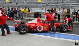 エキゾーストノートとギャラリーの歓声が、ひときわ高く響いていたサーキット。こちらではサーキット専用車FXXと599XXが同時に走り、F1までもが甲高い轟音を響かせていた。当然のことながら公道走行不可であるこれらのモデルが、いっせいに走るさまを見ることができるのはサーキットのなかだけ。実際に手を触れたり、コックピットのなかをのぞき込んだりできるのも今日だけ。特別な瞬間を見逃さぬよう、ピットには愛用のカメラを手にした大勢のギャラリーが集まっていた。