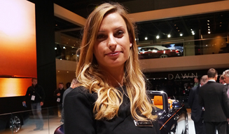 2015年のフランクフルトショーの、もうひとつの華は女の子たち(これはどのショーもおなじですね)。クルマの横に立つモデル、クルマの隣りにいて説明を担当するコンパニオン、プレスの受付けをして資料を渡したりするレセプショニストなど、役割はさまざま。
