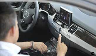 そんな亀石氏に、今回はAudi Approved Automobile 有明がもつ認定中古車、「Audi A8」をテストしてもらった。3.0リッターV6エンジンをスーパーチャージャーで過給する2011年モデル、つまり最新の「A8」だ。乗り込むとすぐに、アウディのマルチメディアインターフェイス「MMI」に興味をしめす。なんでもショーなどでは、詳しい機能がわからず、ぜひ自分でさわってみたかったとのこと。