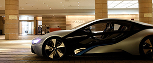 「i8 Concept」が、都内某所に出没。目撃情報によれば、その場所とは、東京・六本木の高級ホテル。実際にi8も登場した映画『ミッション・インポッシブル 4』のワンシーンである、高級車がズラリと並んだドバイのホテルを彷彿させるエントランスの一角に停まっているという。