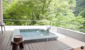各部屋のデッキには専用の露天風呂が設けられていて、伊豆の山間の澄みきった空気のなかで24時間入浴できるのも人気の理由だ。