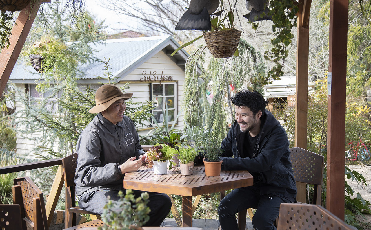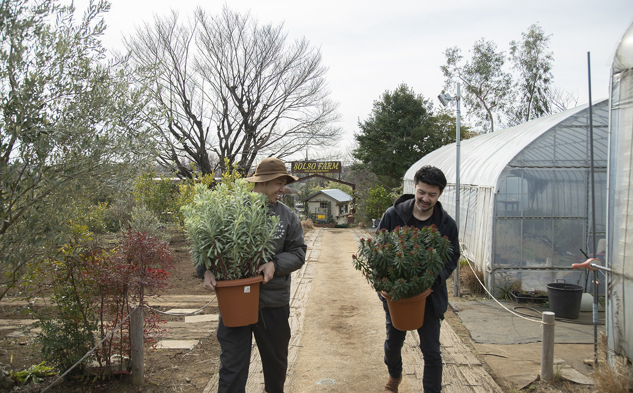 藤井さんを待ってくれていたのはSOLSOのデザイン部門を統括する増田晃さん。藤井さんが3年前に葉山に住まいを移した際、その庭の土作りから面倒を見てもらった。