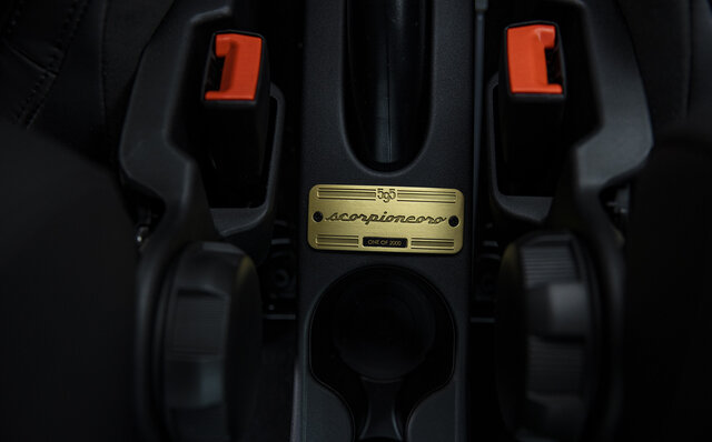 専用17インチ・14スポークアルミホイールに205/40R17サイズのタイヤの組合せ。ブラック仕上げのブレーキキャリパー。ゴールドスコーピオン・ボンネットステッカー。サソリは創設者カルロ・アバルトの星座である。