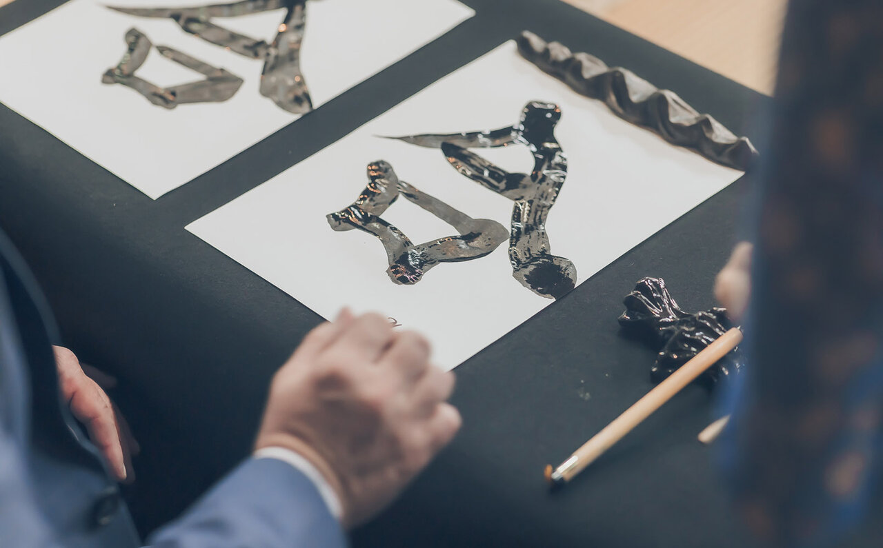 「どれくらいの時間をかけてイメージを温めたのですか」と尋ねるフィリップ社長に、「お題を伺ってから、いまお会いするまでずっと考えていました」と笑顔で答える岡西さん。フィリップ社長がかつてインタビュー取材の際に、家族との時間を大切にしていると語ったというエピソードから、「響鳴」という言葉が思い浮かび、最終的にフィリップ社長と対面したときにこの文字に決めたのだそう。