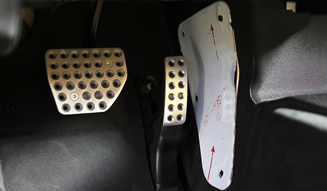 助手席側に目をやるとグローブボックスは見当たらず、そこにはパッセンジャー用の大型のニーパッドが取り付けてある。そしてカーペットが張られていないフロアには前方に巨大なフットレストが設けられている。どちらも、強大な加速Gにさらされる乗員が少しでも安楽でいられるようにするための“心配りグッズ”だが、まるで往年のラリーカーを見ているようで気分が盛り上がってくる。