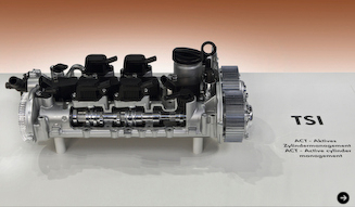 さらにこの心臓には、開発陣が「この先、すべてのTSIエンジンに標準採用の予定」と語る、注目のテクノロジーも採用されている。それは、“ACT”(アクティブ・シリンダー・マネジメント)と呼ばれる2気筒休止のメカニズム。エンジン回転数が1,400~4,000rpm、発生トルクが25~100Nmの範囲で、2番・3番気筒のバルブ駆動をとめ、気筒の作動を休止。ポンピングロスを減らして燃費の向上をはかるというのが、このアイテムを採用した目的だ。ちなみに、この運転領域は先のNEDCモードでの、ほぼ70パーセントに相当し、結果として削減可能な燃料は100kmあたり0.4リッターに達するという。