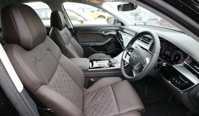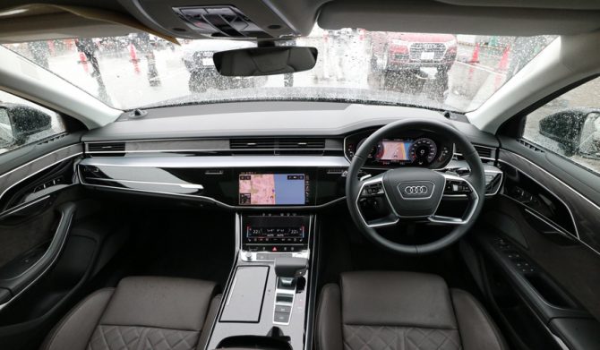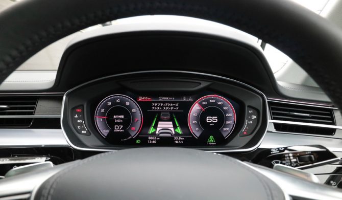 インテリアは、ダッシュボードやコンソール部分をすべて平面のグラスエリアとし、パワーオンでメーター類や各種スイッチが浮かび上がる「アウディバーチャルコックピット」とすることで先進イメージが強調されており、未来的な空間となっているのも特徴。あたかも最新のクールなビジネスルーム然としていて、こうした点はメルセデスのSクラスとは成り立ちが異なるところである。