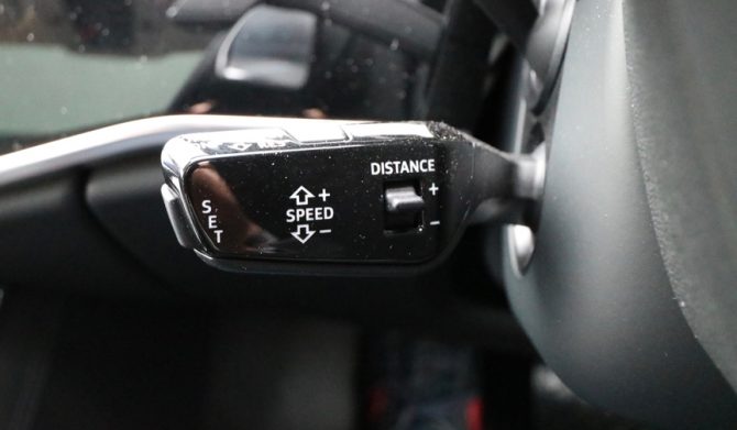 ステアリングポスト左奥にあるコラム式レバーで追従運転をONにしてみると、システムが作動する様子がデジタルメーターのセンター部分に大きく表示され、前走車を正確にトレースし始める。車線中央の維持やコーナリング時も、ステアリングに触れる手に車両の意思が伝わるようななめらかなトルクが感じられ、高度なコントロールが行われていることが確認できた。