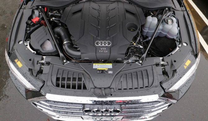 今回試乗した黒に近いヴェスヴィオスグレーメタリックカラーのA8は、「55」「60」という2グレードのうちトップグレードとなる60シリーズで、搭載するエンジンは最高出力338kW(460ps)/5,500rpm、最大トルク660Nm/1,800-4,500rpmを発生する排気量4.0リッターのV型8気筒直噴ツインターボ(ちなみに55は3.0リッターV6エンジン)。8段ATとクワトロシステムを介して4輪を駆動する。