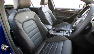 新型ゴルフRの内装は、先代より控え目な印象だ。先代はレーシングカーをおもわせるバケットタイプのシートをそなえていたり、各所にレースとの関係をうかがわせる視覚的な演出がほどこされていた。