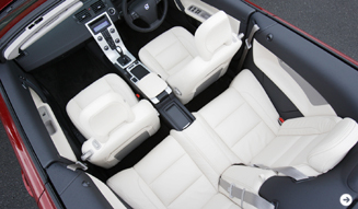 運転したのはラグジュアリーパッケージ装着車で、内容はセミアニリン本革シート、プレミアムサウンドシステム、死角情報を提供するBLIS(ブラインドスポットインフォメーションサービス)、キーレスドライブ、ボルボ・ガードシステム、18インチタイヤなどからなる40万円のオプションパッケージ。セミアニリン本革シートは、最近の高級車がこぞって採用していて、吸い付くような手触りがよい。内装に凝っているのは、電動格納式メタルルーフを開けたときにどう演出するかを重視したため。こういうクルマでは重要なことだ。