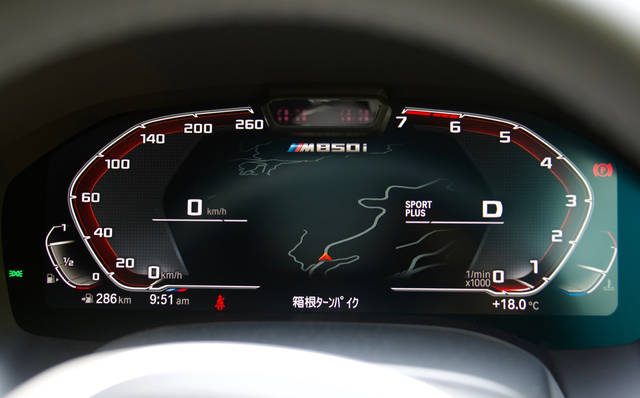 今回の試乗会場は、通い慣れた箱根のワインディングロードが舞台だ。初夏の日光を浴びつつ駐車場に留め置かれた新型8シリーズクーペは、伸びやかなスタイルをこれでもかと見せつけてくれ、我々ジャーナリストの目を楽しませてくれたのだ。