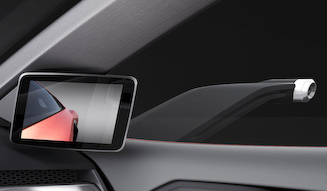 インテリアは、カーボンとアルミ、本革を多用。車両は2シーターで、浮いたようなデザインをもつメータークラスターが特徴となり、リアビューミラーのかわりに小型カメラとモニターの組みあわせも採用している。2つの旅行カバンが入るラゲッジスペースを、車体前方のボンネット下に用意し、実用性も考慮した。