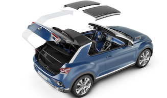 内外装ともに独特のデザインをもつT-ROCは、クーペのようなシルエットの2ドアモデルでありながら、四輪駆動の悪路走破性をそなえ、さらに開放的なコンバーチブルにもなるという多様性をもつSUV。