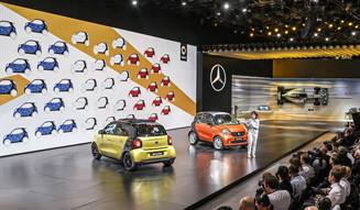 ルノーは、天井からつり下げた無数の球形ランプが、クラゲよろしくゆるやかな上下動を繰り返すという幻想的な演出で、ブースを訪れるひとを楽しませてくれた。メルセデス・ベンツと共同開発した「トゥインゴ」をずらりと並べて、内外装のカラリングで多様性を強調したのも特徴的だ。