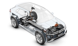 「GTE」とはこれまでゴルフやパサートでプラグインハイブリッドモデルに用いられてきたサブネームである。22インチの大径ホイールが目立つ5人乗り4ドアの大柄な車体が目を惹くクロスクーペGTEも同様。3.6リッターV6ガソリンエンジンに電気モーターを組み合わせたパワートレインを搭載したプラグインハイブリッドだ。