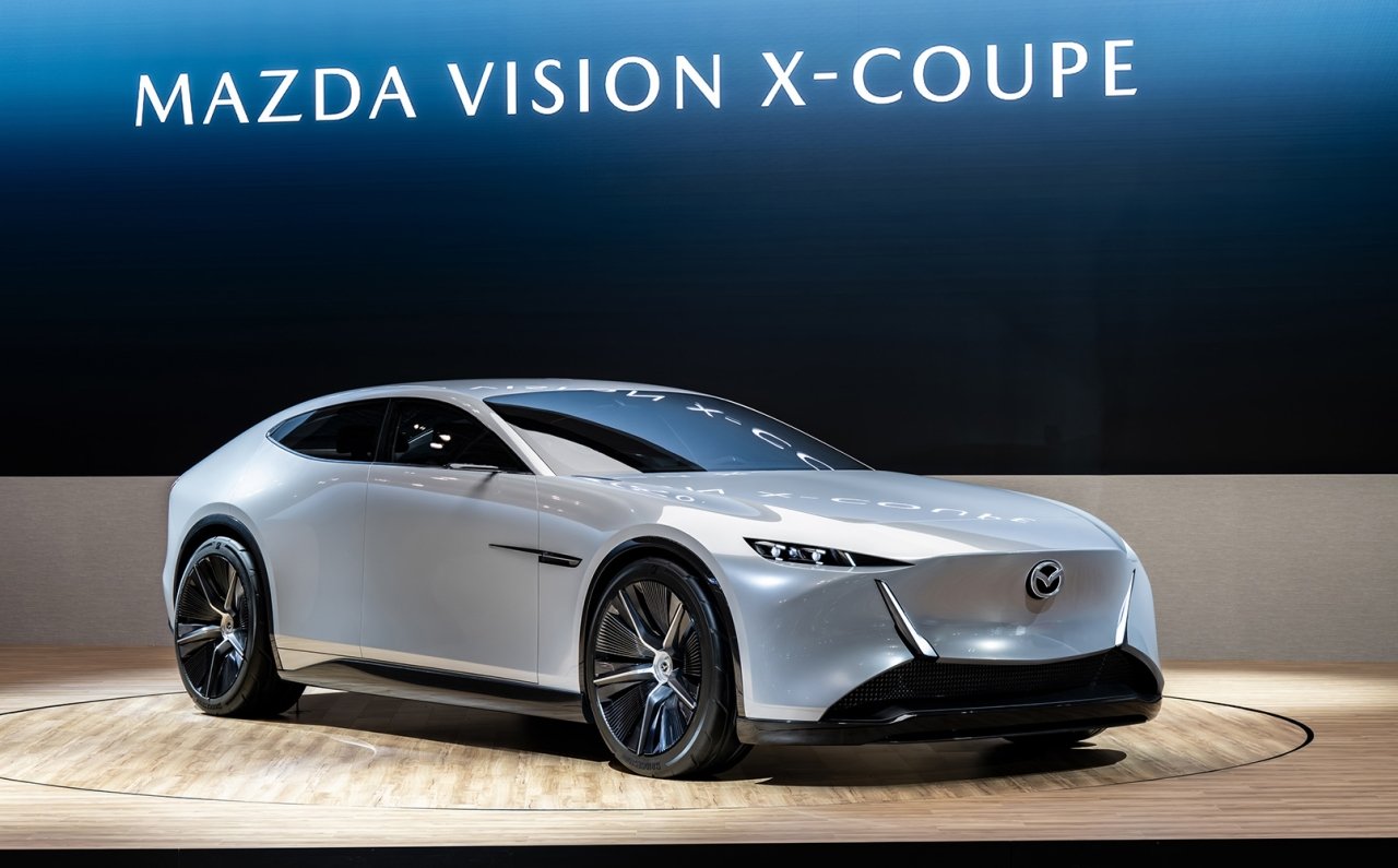 「MAZDA VISION X-COUPE」は「魂動(こどう)」デザインをさらに進化させたクロスオーバークーペで、2ローター・ロータリーターボエンジンとモーター、バッテリーを組み合わせたプラグインハイブリッド(PHEV)システムを搭載。
