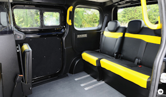 客室はニューヨークのイエローキャブ仕様同様に広いスペースが確保されており、前後スライド可能な3人掛けのシートと、さらに客室前方の仕切り面には対面して座れるように折りたたみの座席が2座取り付けられ、合計5人が乗ることができる。