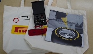 ピレリのモーターホームで供される秘伝レシピ集、タイヤ型のストラップキーホルダー、エコバッグ。さらに「フェラーリ」の真紅のUSBメモリーをセットにしました。2名様にプレゼント。