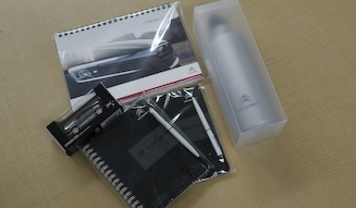 シトロエンの卓上カレンダーと、コンパクトなボールペン付きメモ帳2冊。さらに「DS5」のミニカーとステンレスボトルをセットにして、1名様に。