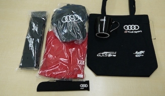 アウディ ロゴ入りTシャツ(Mサイズ)、帽子、扇子、折りたたみ式の座布団、さらにアウディロゴ入りマグカップをバッグに入れて、1名様にプレゼントいたします。