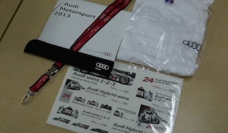 WECを戦う、アウディ「R18」のステッカー、扇子、Tシャツ(XLサイズ)、ネックストラップ、そして卓上カレンダーをセットにして、1名様にプレゼントいたします。