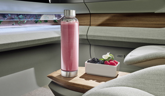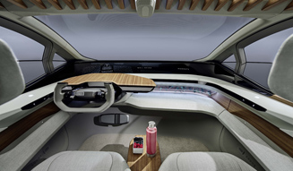 クルマは家庭と職場に次ぐ「第3の生活の場」となることを想定し、インテリアにはさまざまな工夫がなされている。例えば走行中の車内でリラックスして食事を楽しむための食器を保持するマグネット、ペダルを踏む必要のない足をのせるダッシュボード下のサポート、クルマと乗員のコミュニケーションを行うフロントウインドウ下の車幅全体にわたる3次元マルチファンクションOLEDモニターによるアイトラッキング、音声入力、ドアレールに設置されたタッチパッドなどだ。