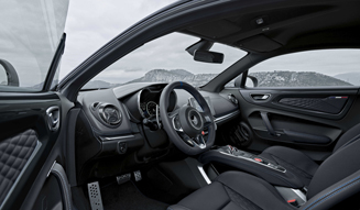 「A110 ノワール」はブラックのボディカラーにブラックの内装を組み合わせ、スポーティなシルエットをより精悍に際立たせたモデル。また専用装備として、ブラックレザーのサベルト社製スポーツシートが与えられている。