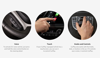 用意されたそのインターフェイスは、アップルらしく極めて簡単でかつシンプルなもの。まずはiPhoneと、CarPlayに対応したクルマとをLightningケーブルで接続。シンクロに成功すると即座に、ダッシュボードにそなわる液晶タッチパネルでの操作が可能となり、またステアリングホイール上のボイスコントロールボタンを押し続けることで、音声アシスタント機能である「Siri」が起動。これにより、ドライバーは運転中であっても注意をそらすことなくCarPlayの操作をおこなえるようになる。