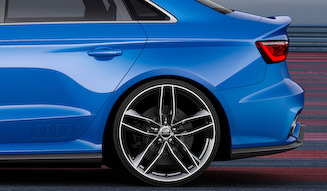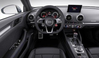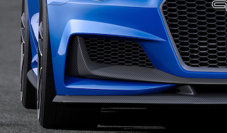 全長は4,490mm、全幅はブリスター化によって1,856mmにまで拡大。全高は1,382mmで、アウディ「S3 セダン」よりも10mmだけ低いが、それ以上の迫力とレーシーな雰囲気を伝える。大型のシングルフレームグリル上には誇らしげに「quattro」の文字が掲げられる。端正なデザインのヘッドライトは、もちろんLED方式を採用した。
