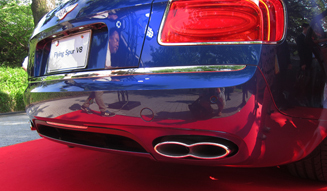 W12とV8モデルのちがいはエンジンだけでない。エクステリアにおいても特別な処理が施されており、ブラック仕上げのフロントバンパーグリル、クローム仕上げの8の字型エキゾーストなど、V8エンジンモデルであることを主張する。ベントレーを象徴するウィングバッジもレッドとなりスポーティーさを増した。