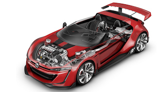 一見大きくも見えるが、GTI ロードスターは全長4,158×全幅1,894×全高1,090mmというスリーサイズで、ホイールベースは2,494mm。前後のオーバーハングが極端に短く、否が応でもスポーティな印象を見る者に抱かせる。カーボン製のCピラーは左右を繋ぐウィング形状とされ、これがリアフェンダーにまでつづきボディを構成するというアイデアもユニークだ。