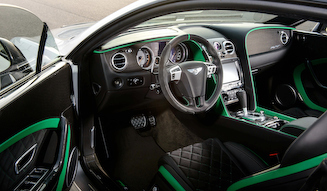グランドツアラーとしてもの性格もあわせもつコンチネンタルGT3-Rの内装には、ブラックやダイヤモンドキルト加工のアルカンターラをもちい、ベントレーのラグジュアリーな空間を演出。アクセントとして、随所に鮮やかなグリーンが添えられる。