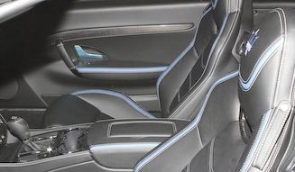 インテリアは、セレクトしたボディカラーに合わせた専用の内装素材がコーディネートされるのも、このモデルにふさわしい演出のひとつだ。たとえば「ロッソ マグマ」をセレクトした場合、レザーはブラックとなり、ステッチはロッソが施される。またカーペットのパイピングやシートのデザインラインにも、ステッチと同色のものが選ばれており、キャビンに一体感とスポーティさを与えるアクセントとなっている。