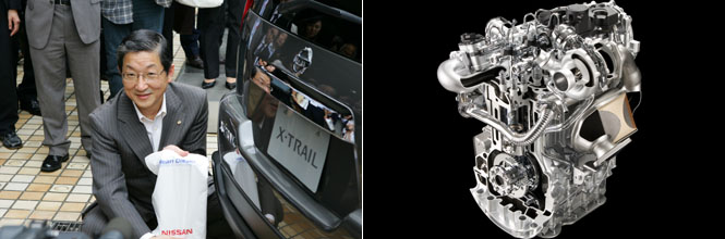 左|日本の「ポスト新長期規制」に適合した最初のモデル「エクストレイル」ディーゼル。日産自動車の志賀俊之COOは、排気ガスにタオルをかざし、汚れがないことをデモンストレーション。